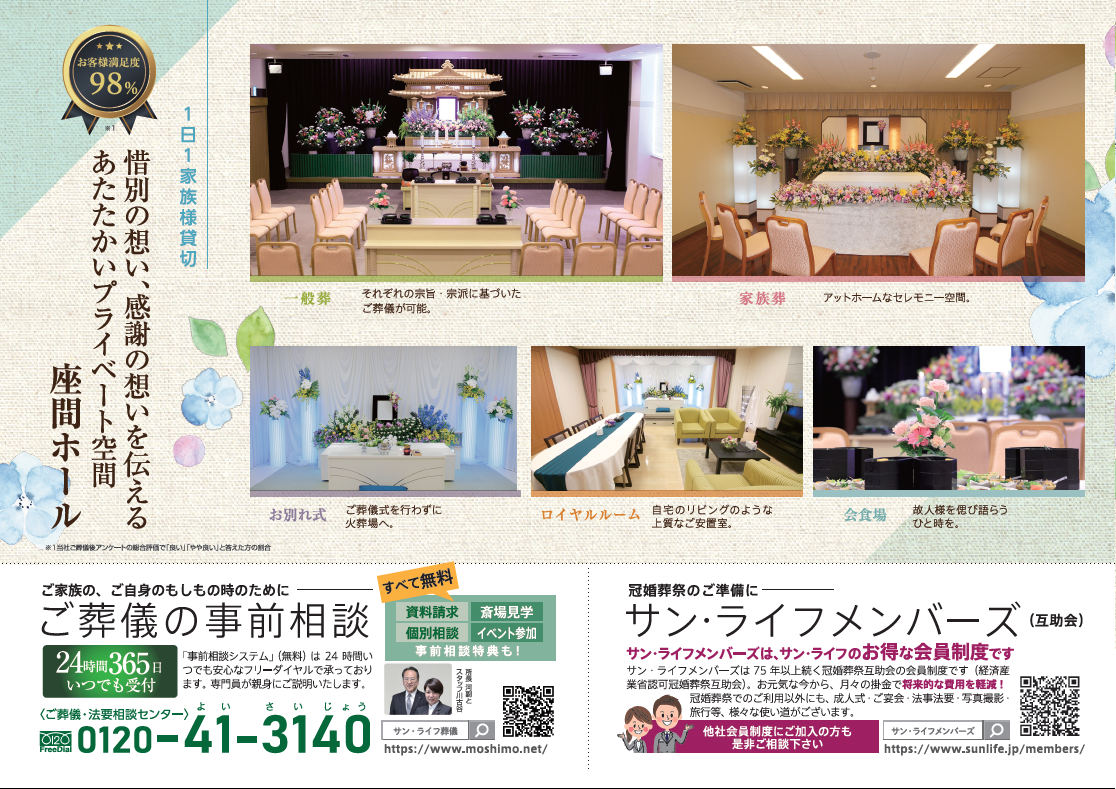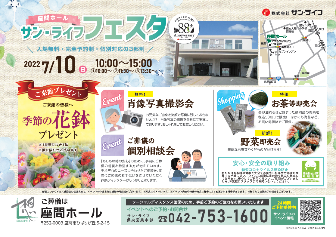 サン・ライフTOP ご葬儀展示会・イベント一覧 【7月10日(日)開催】サン・ライフ フェスタ(座間ホール)