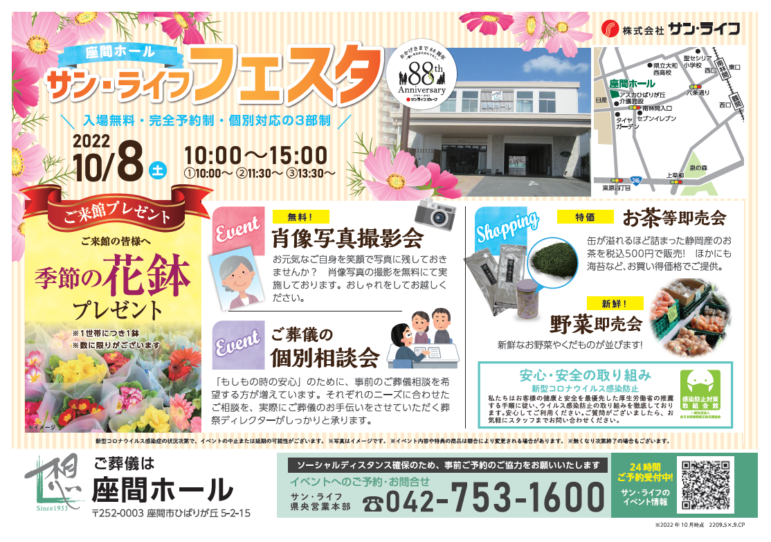 サン・ライフTOP ご葬儀展示会・イベント一覧 【10月8日(土)開催】サン・ライフ フェスタ(座間ホール)