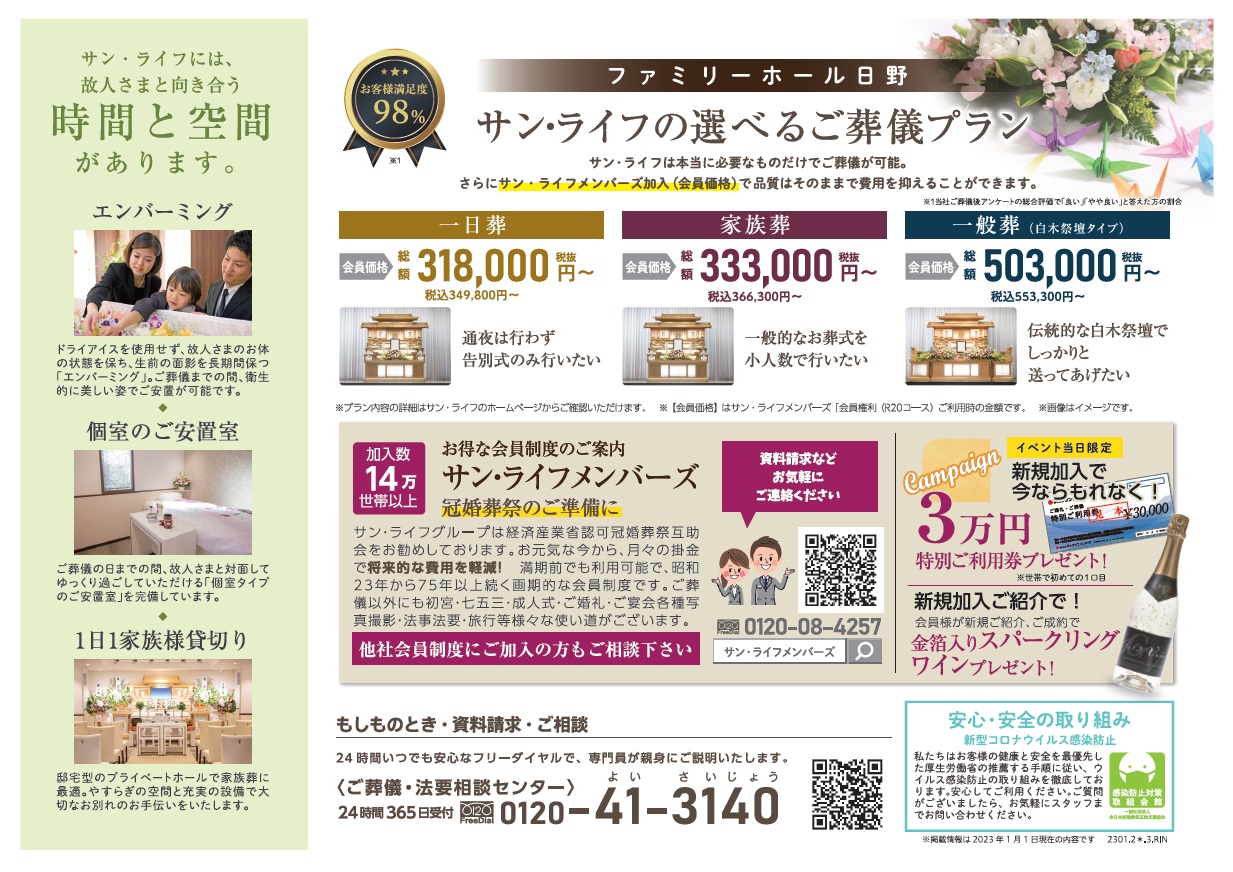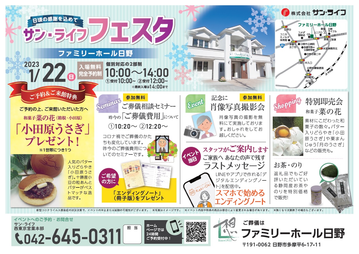 【1月22日(日)開催】サン・ライフ フェスタ(ファミリーホール日野) - 葬儀、家族葬なら株式会社サンライフ 【公式】