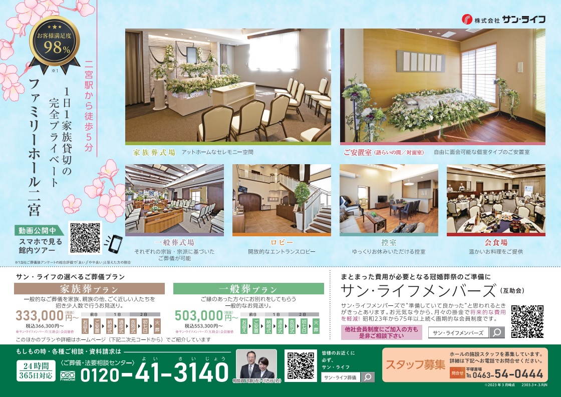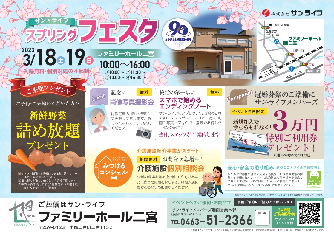 サン・ライフTOP ご葬儀展示会・イベント一覧 【3月19日(日)開催】 スプリング フェスタ(ファミリーホール二宮)
