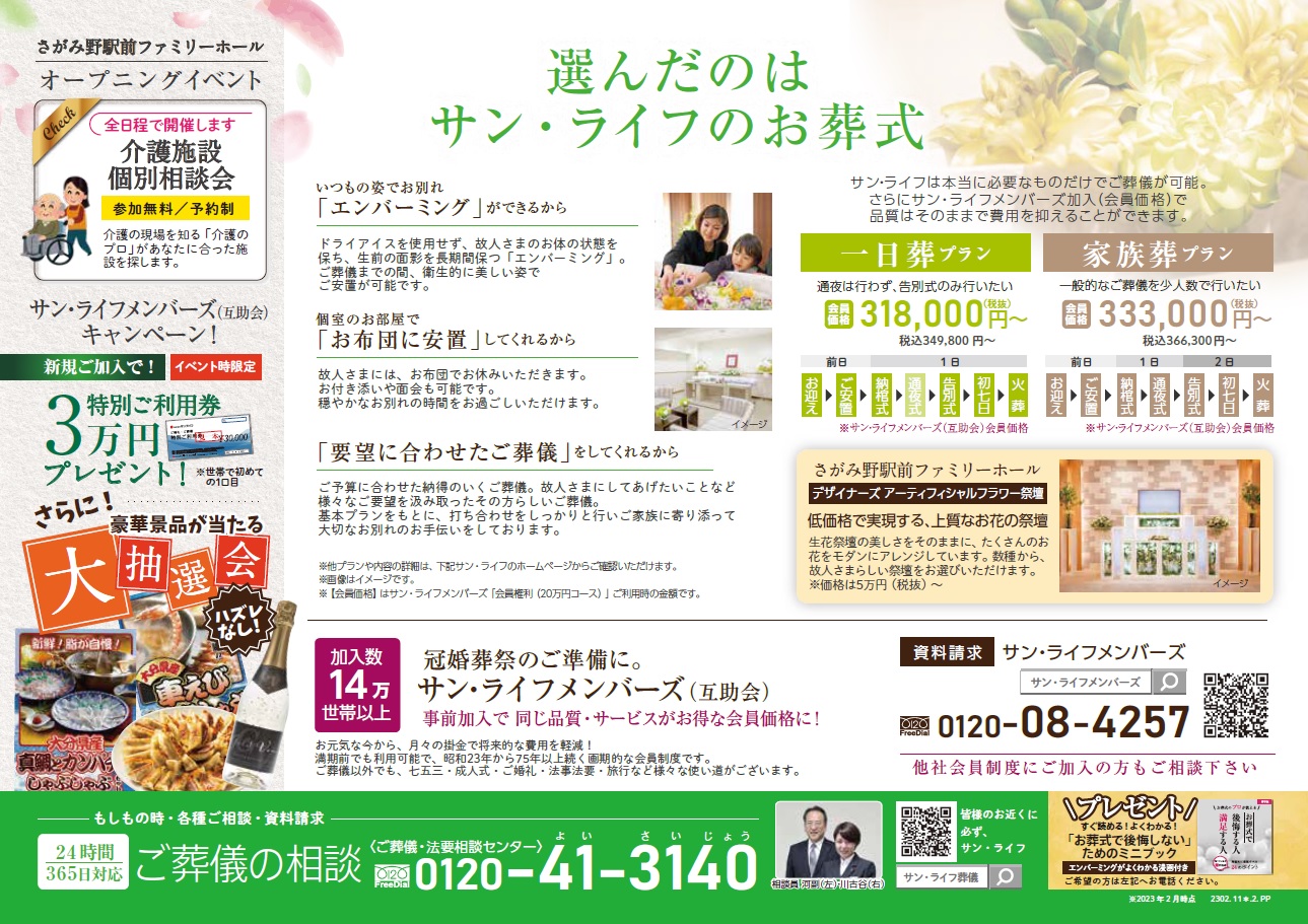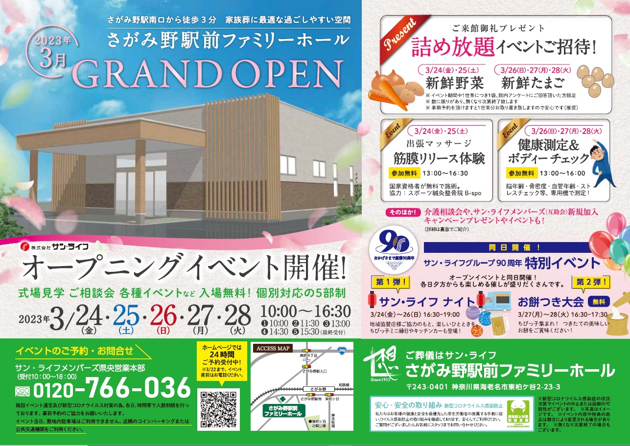 サン・ライフTOP ご葬儀展示会・イベント一覧 【3月27日(月)開催】グランドオープンイベント(さがみ野駅前ファミリーホール)