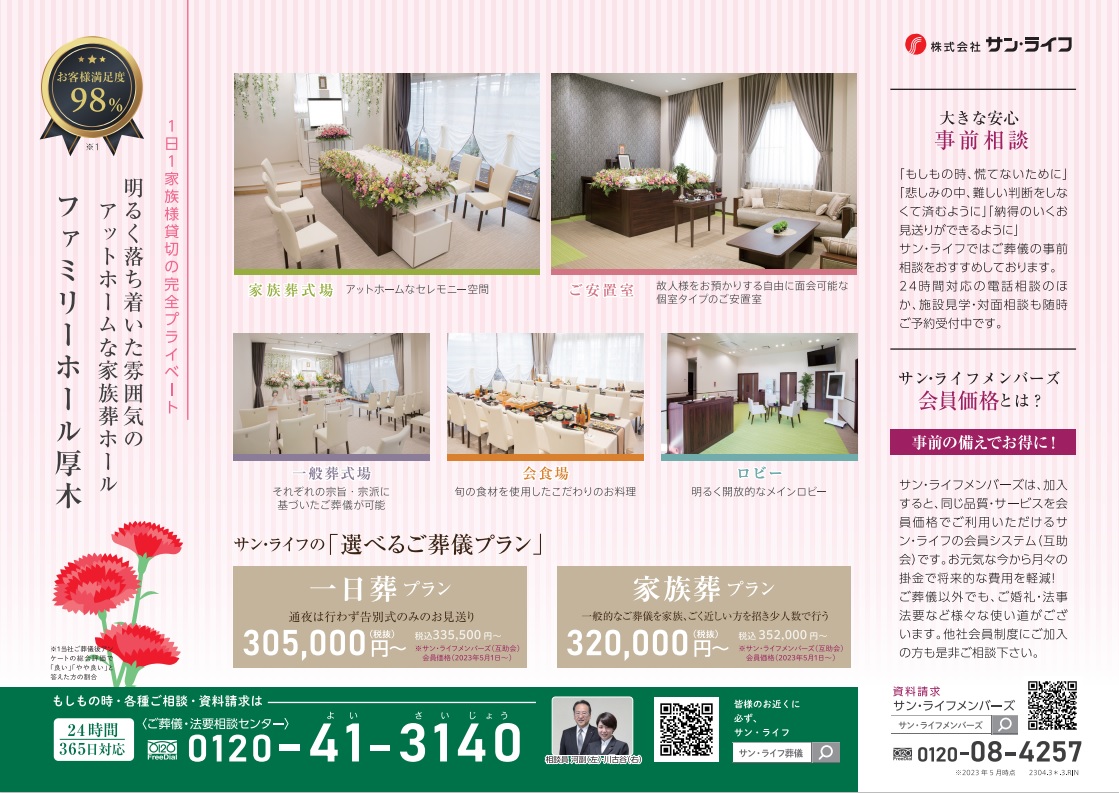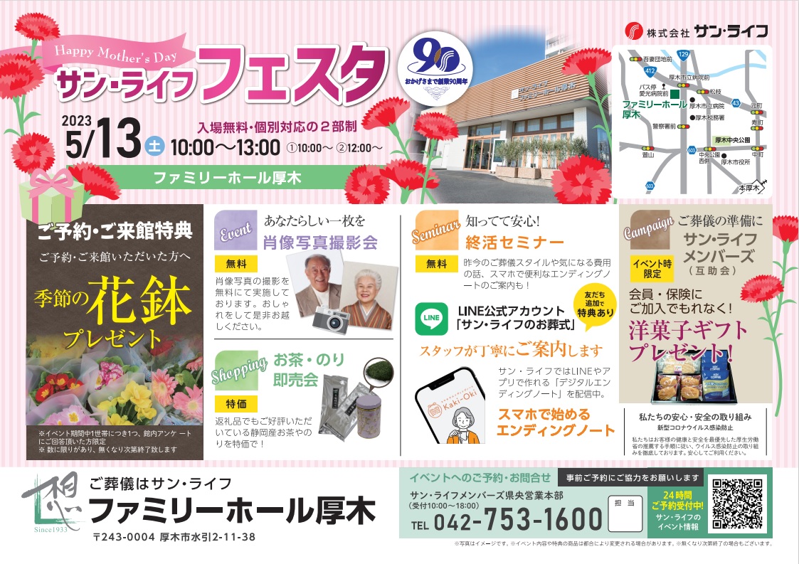 サン・ライフTOP ご葬儀展示会・イベント一覧 【5月13日(土)開催】サン・ライフフェスタ(ファミリーホール厚木)
