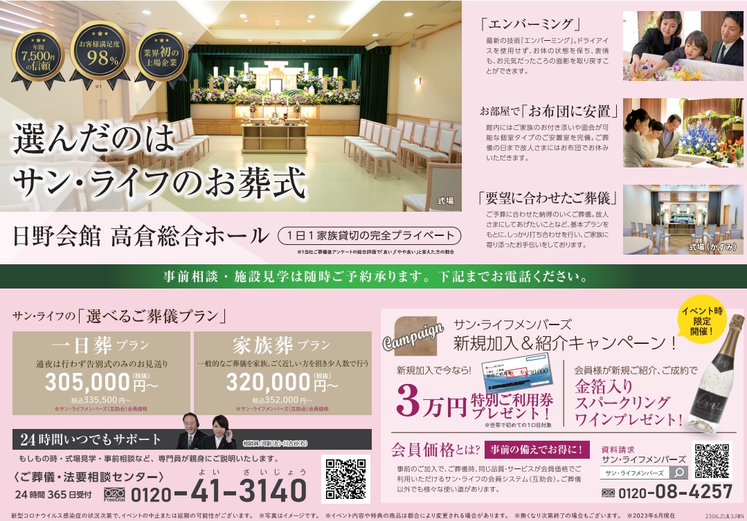 サン・ライフTOP ご葬儀展示会・イベント一覧 【6月25日(日)開催】サン・ライフフェスタ(日野会館 高倉総合ホール)