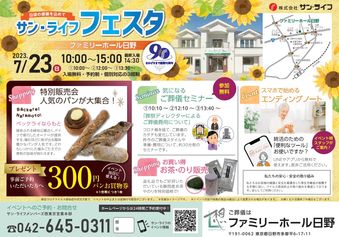 サン・ライフTOP ご葬儀展示会・イベント一覧 【7月23日(日)開催】サン・ライフフェスタ(ファミリーホール日野)