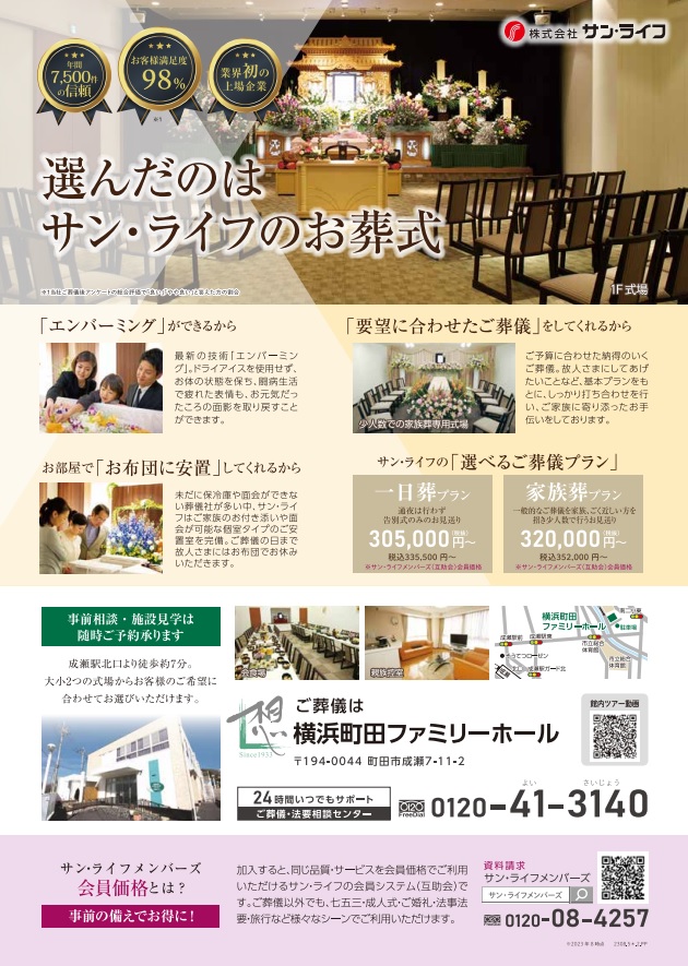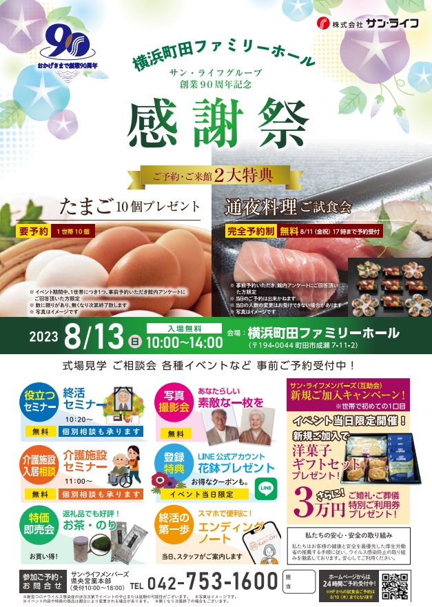 サン・ライフTOP ご葬儀展示会・イベント一覧 【8月13日(日)開催】サン・ライフ フェスタ(横浜町田ファミリーホール)