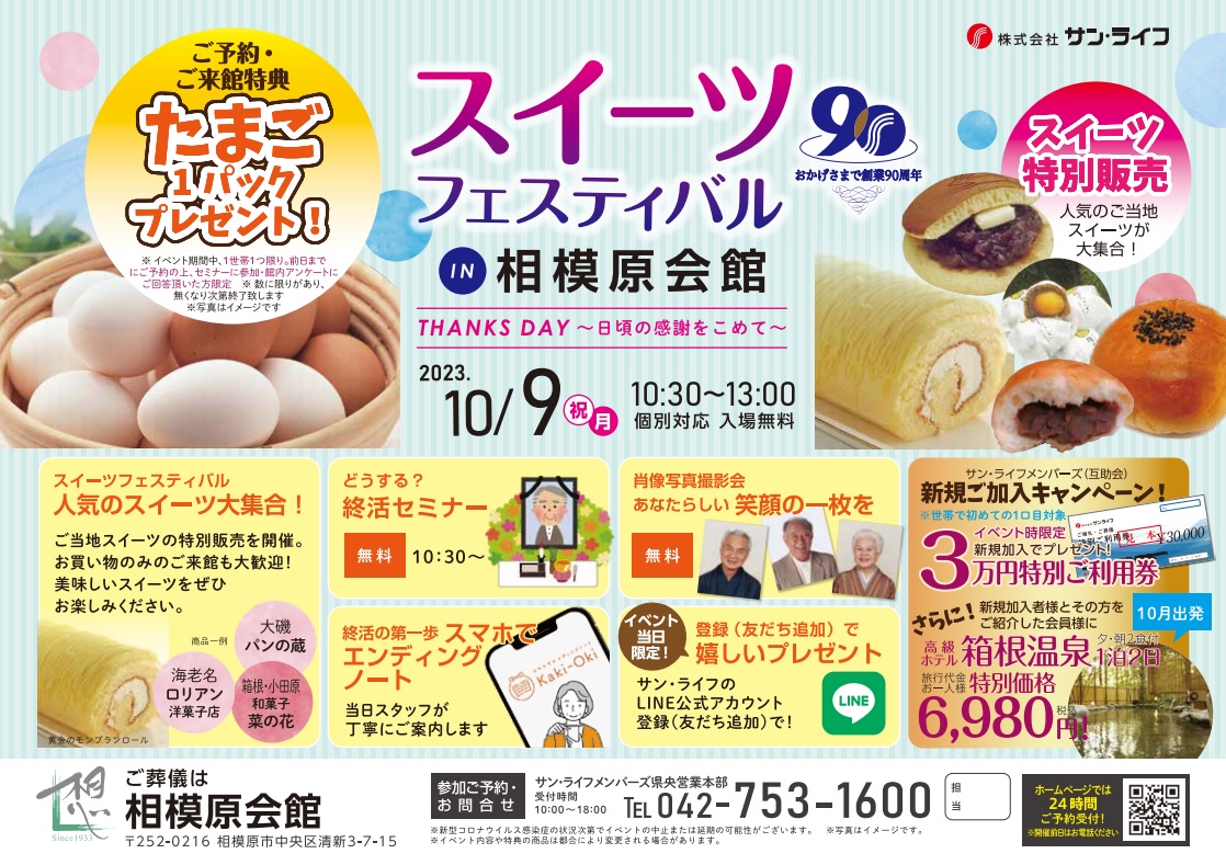 サン・ライフTOP ご葬儀展示会・イベント一覧 【10月9日(月)開催】スイーツフェスティバル(相模原会館)