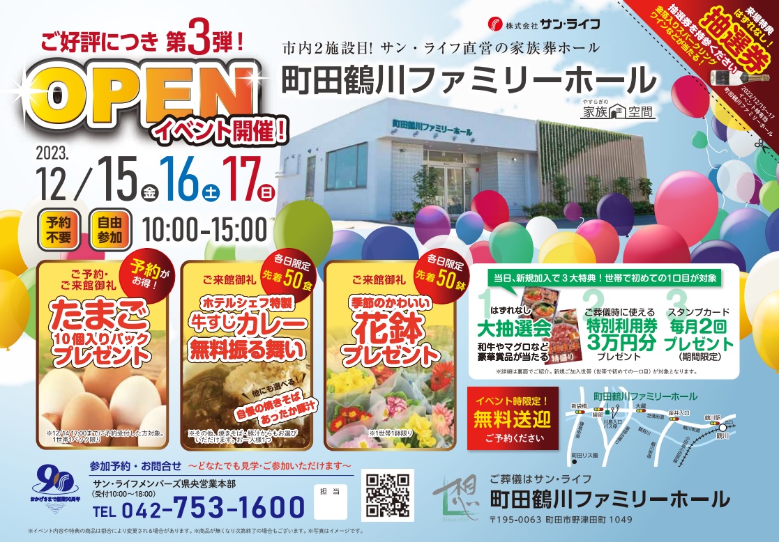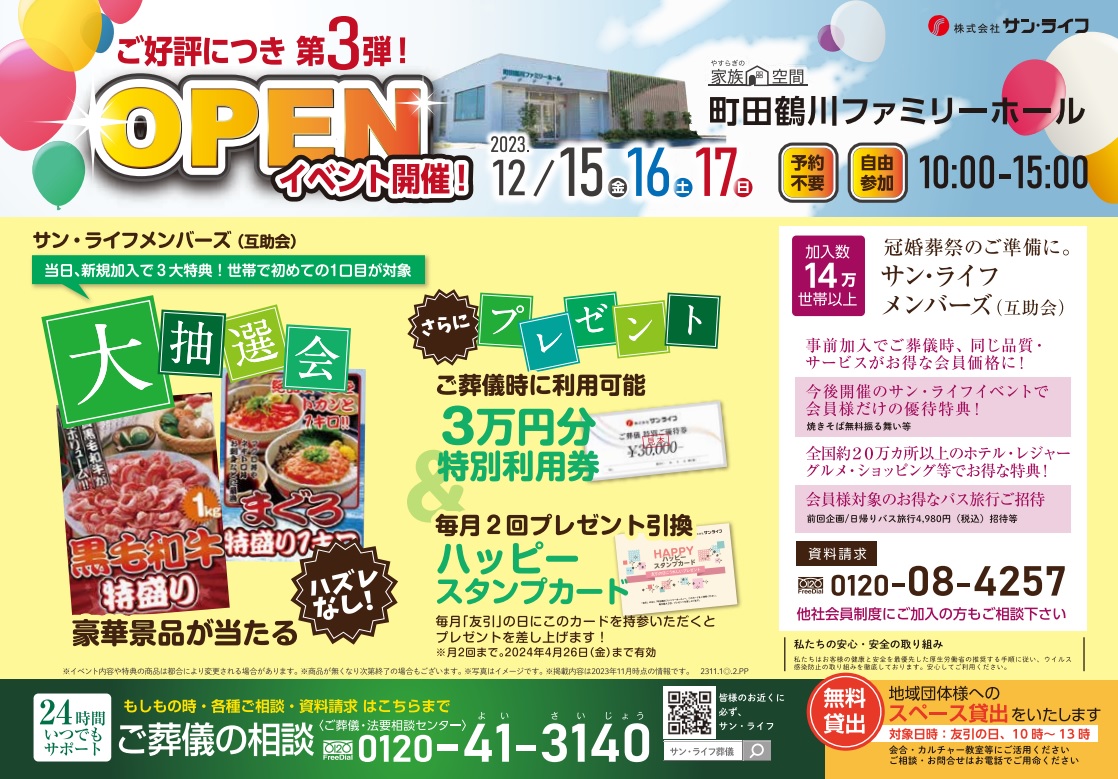 サン・ライフTOP ご葬儀展示会・イベント一覧 【12月15日(金)開催】オープンイベント(町田鶴川ファミリーホール)