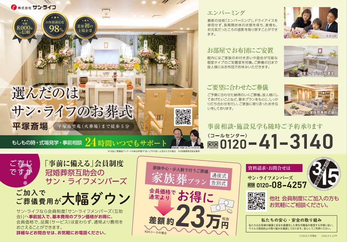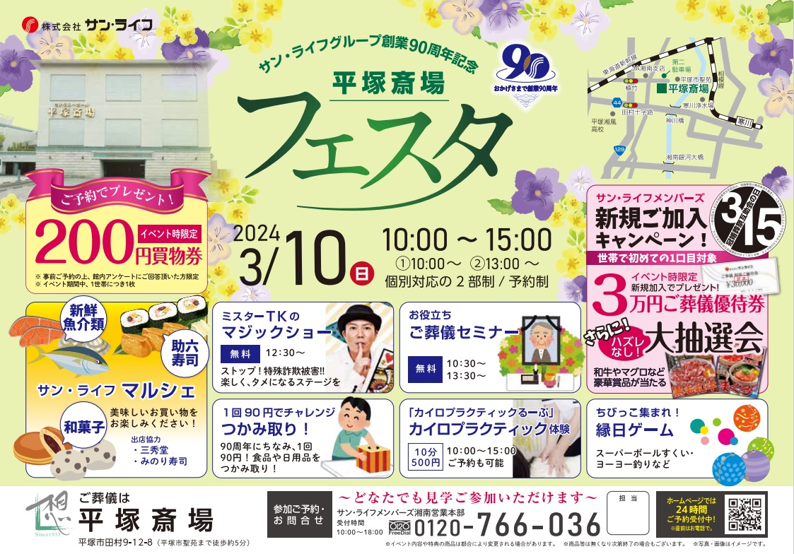 サン・ライフTOP ご葬儀展示会・イベント一覧 【3月10日(日)開催】サン・ライフ90周年記念フェスタ(平塚斎場)