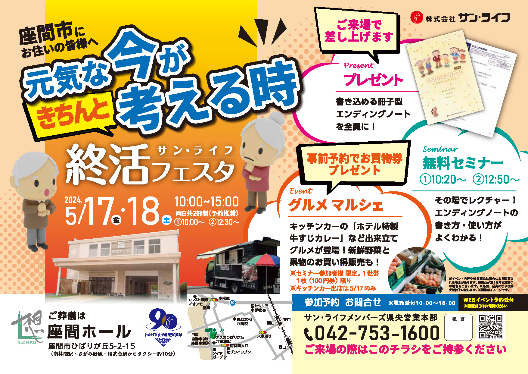 サン・ライフTOP ご葬儀展示会・イベント一覧 【5月17日(金)開催】サン・ライフ 終活フェスタ(座間ホール)