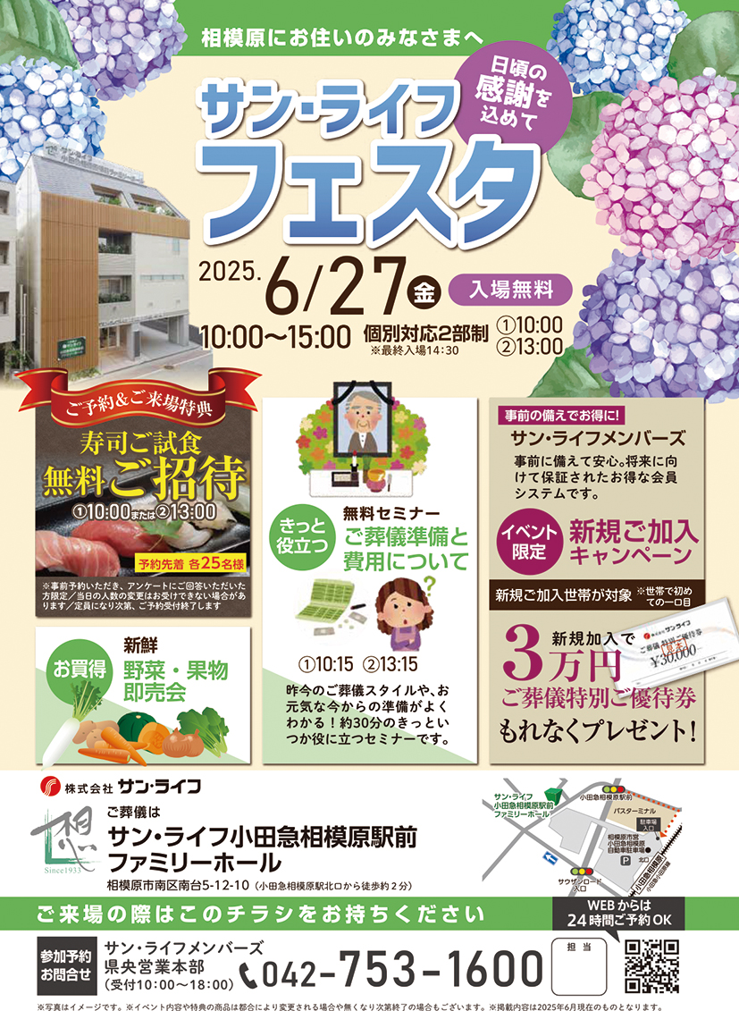 サン・ライフTOP ご葬儀展示会・イベント一覧 【6月27日(金)開催】サン・ライフフェスタ(サン・ライフ小田急相模原駅前ファミリーホール)