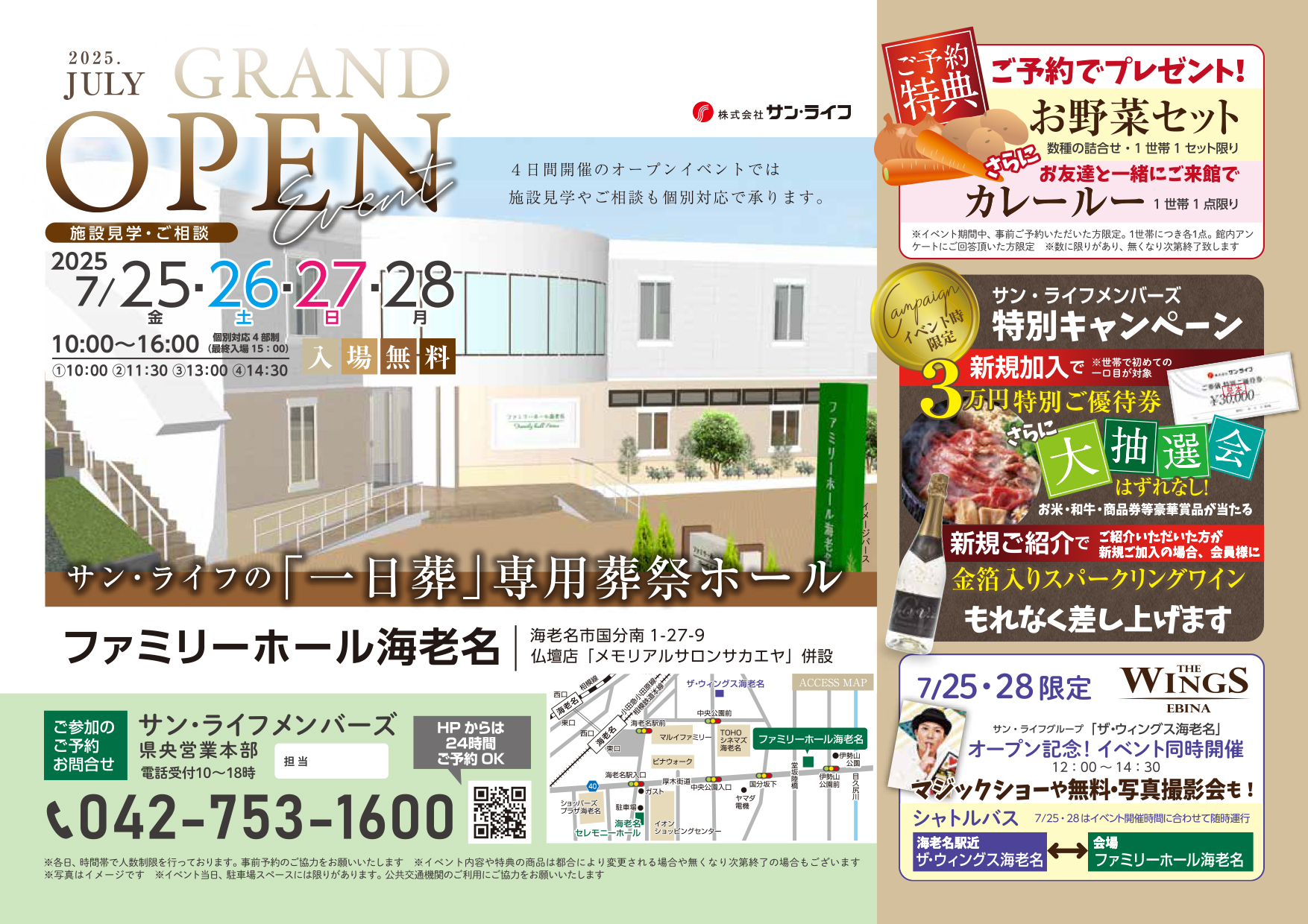 サン・ライフTOP ご葬儀展示会・イベント一覧 【7月28日(月)開催】オープンイベント(サン・ライフ ファミリーホール海老名)