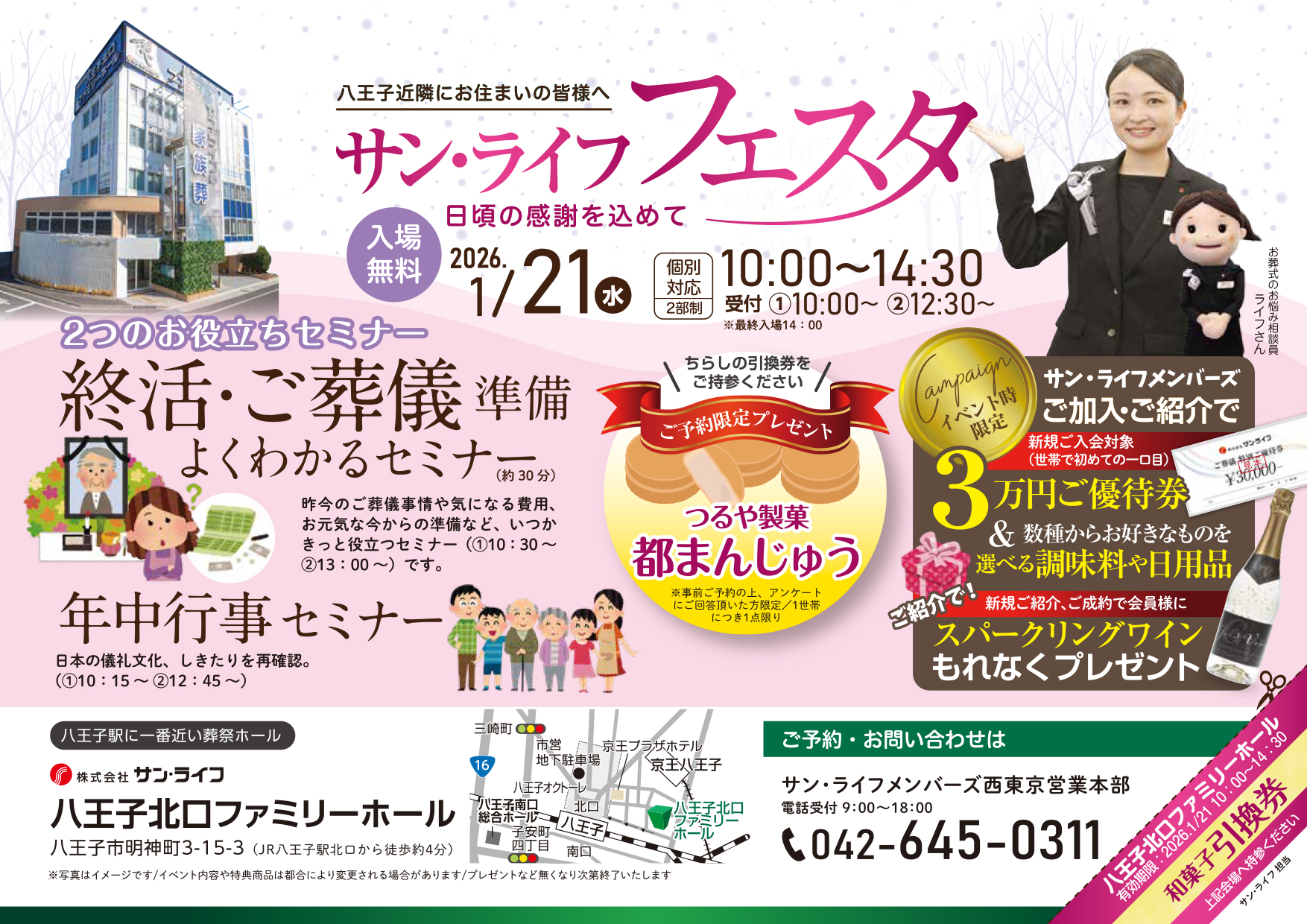 サン・ライフTOP ご葬儀展示会・イベント一覧 【1月21日(水)開催】サン・ライフ フェスタ(八王子北口ファミリーホール)
