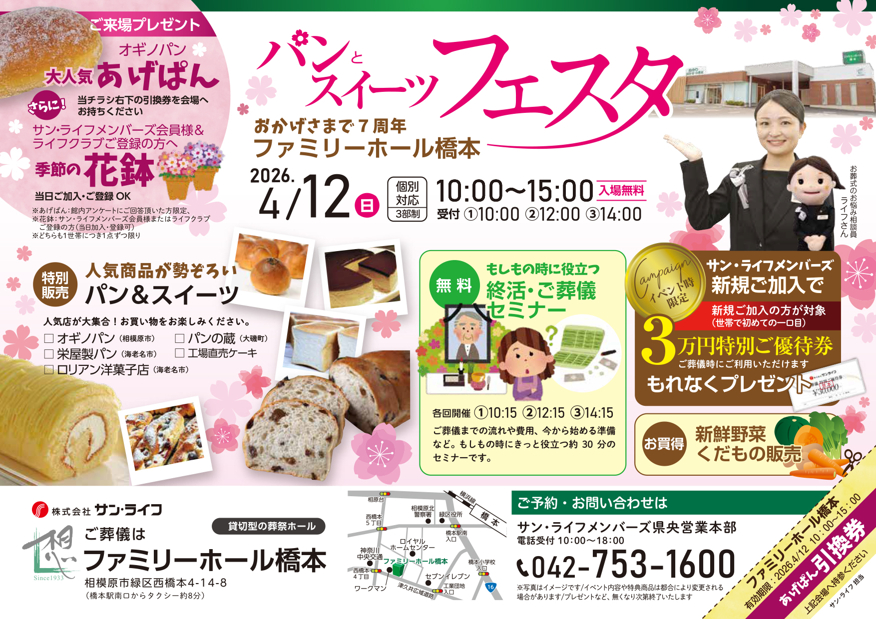当日は、有名店のパンやスイーツの特別販売、もしもの時に役立つ無料終活・ご葬儀セミナー、お得なキャンペーンなど、盛りだくさんの内容でお届けします。