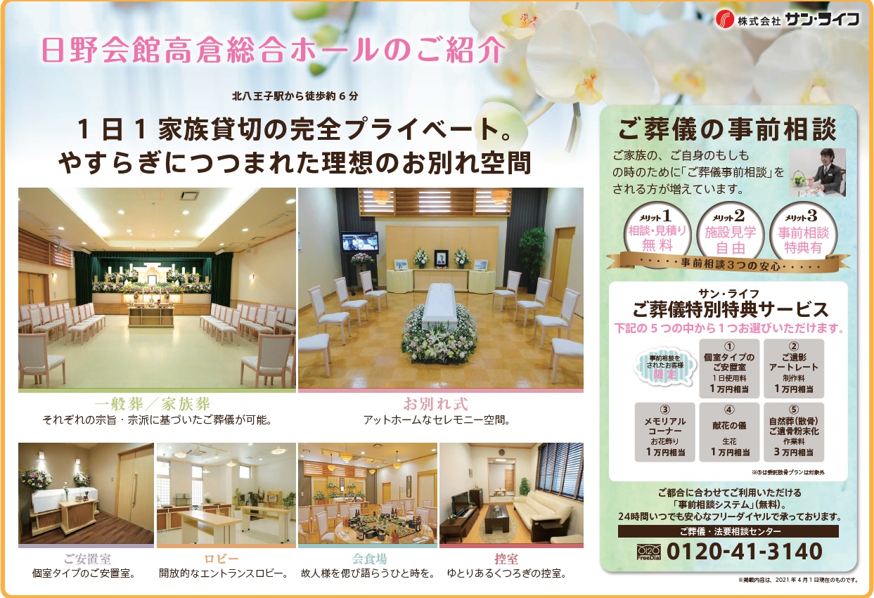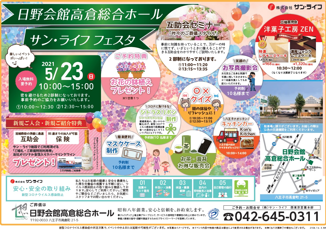 サン・ライフTOP ご葬儀展示会・イベント一覧 【5月23日(日)開催】サン・ライフ フェスタ( 日野会館 高倉総合ホール)