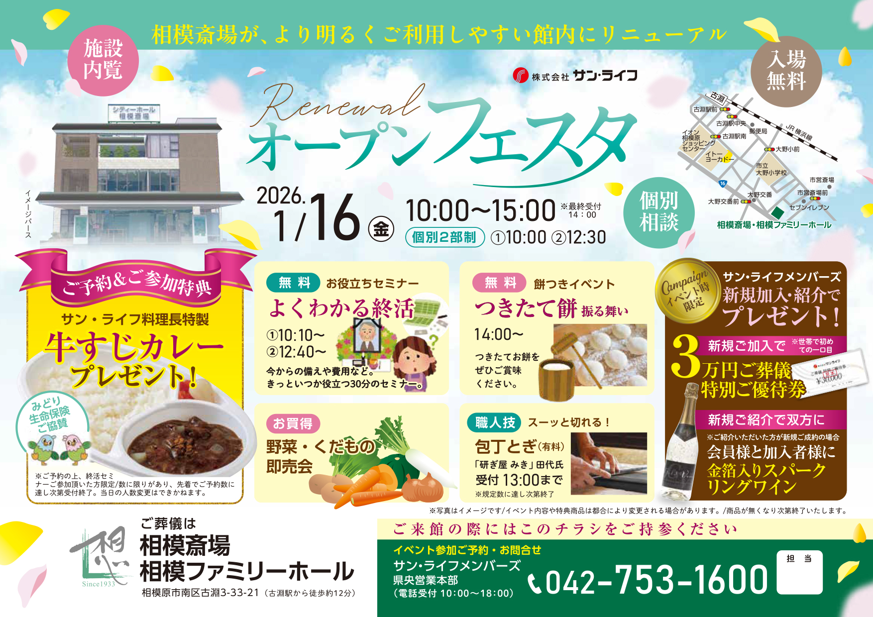 2026年1月16日(金)に「リニューアルオープンフェスタ」を開催いたします。 施設内覧をはじめ、サン・ライフ料理長特製の牛すじカレーのプレゼントや、つきたてのお餅振る舞い、野菜・果物の即売会など、地域の皆様にお楽しみいただけるイベントが盛りだくさんです。 将来のために備えておきたい「終活セミナー」も無料で実施いたします。ぜひお気軽にご来館ください。