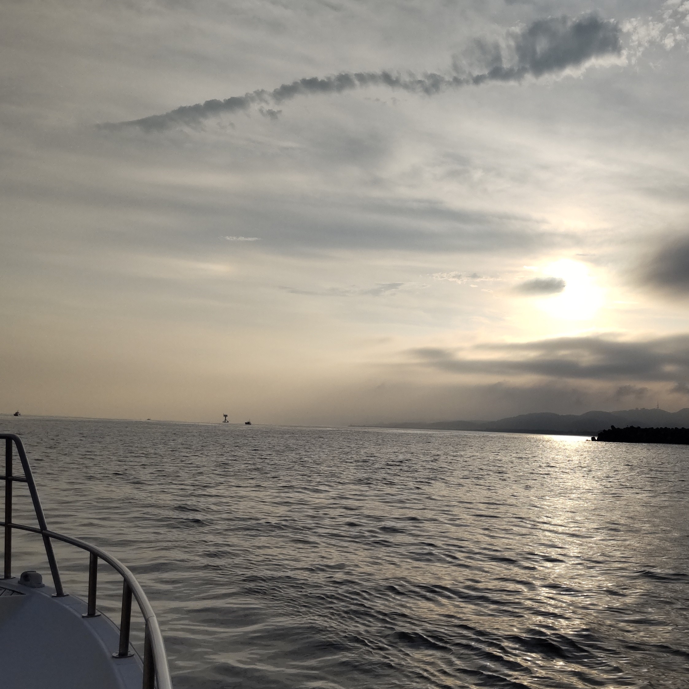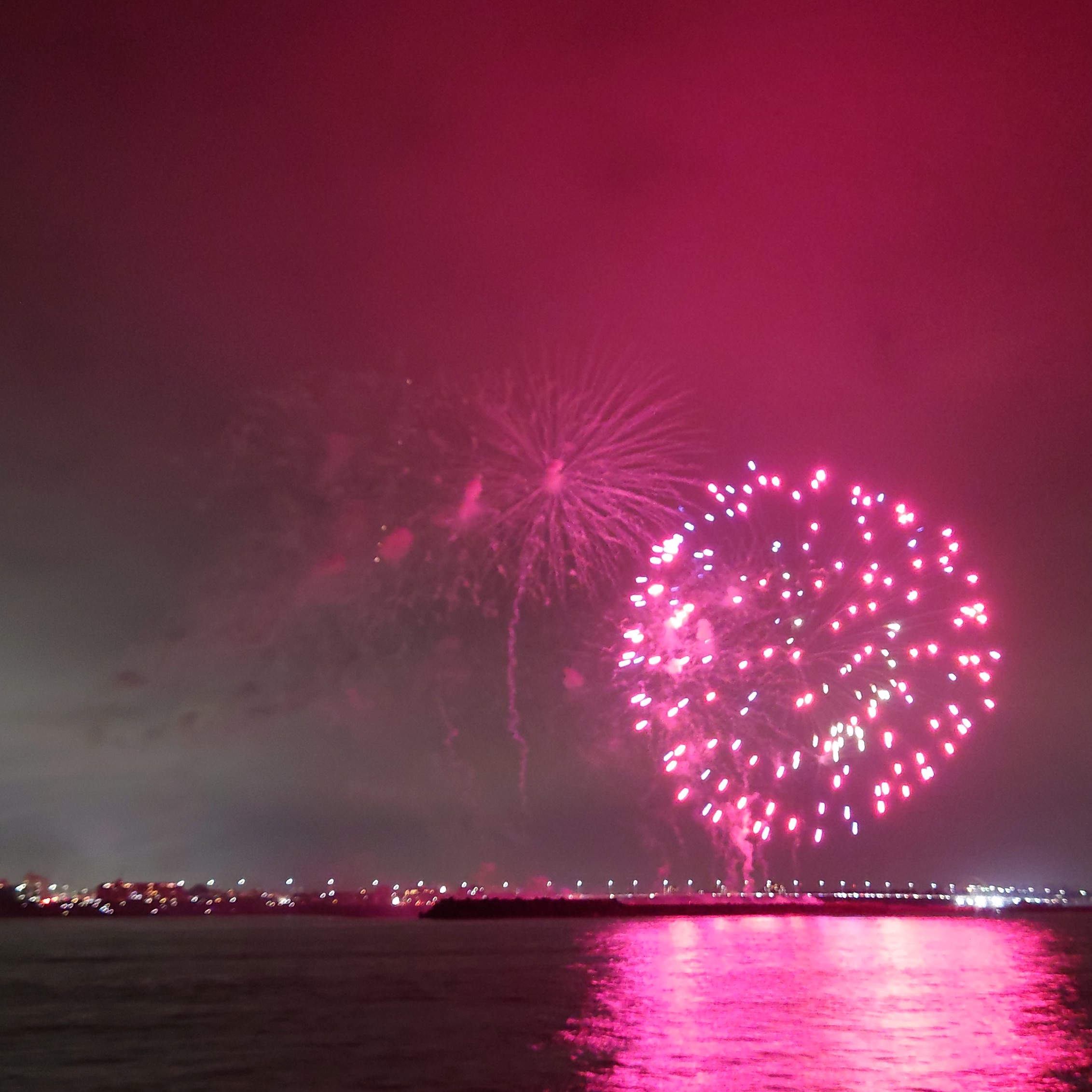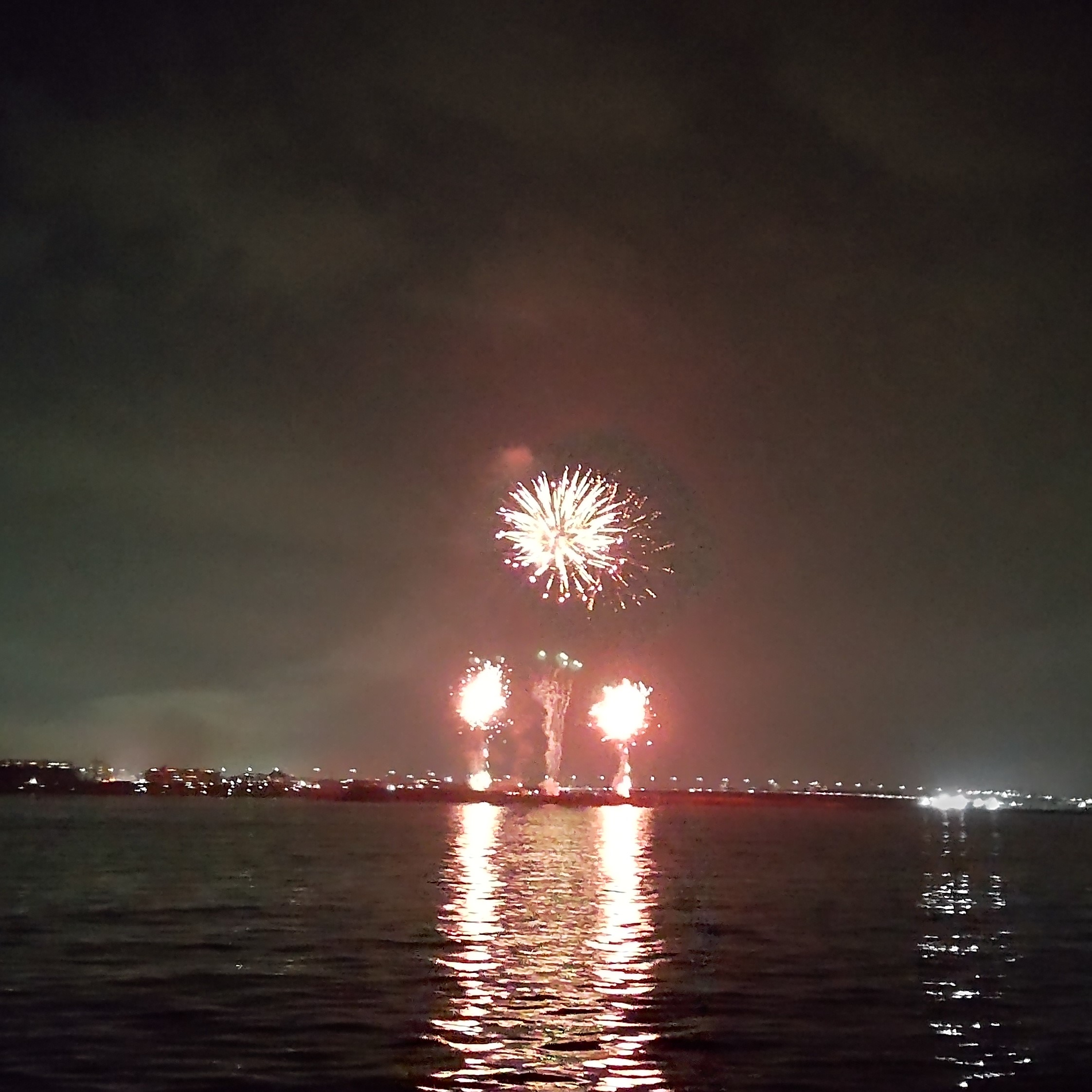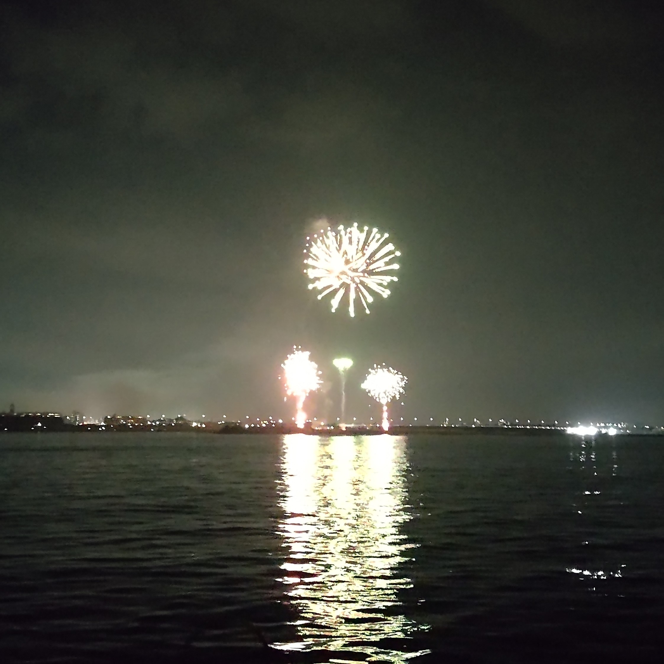今回は「風もなく凪の海」でしたので沖合待機。そのまま花火鑑賞といたしました。