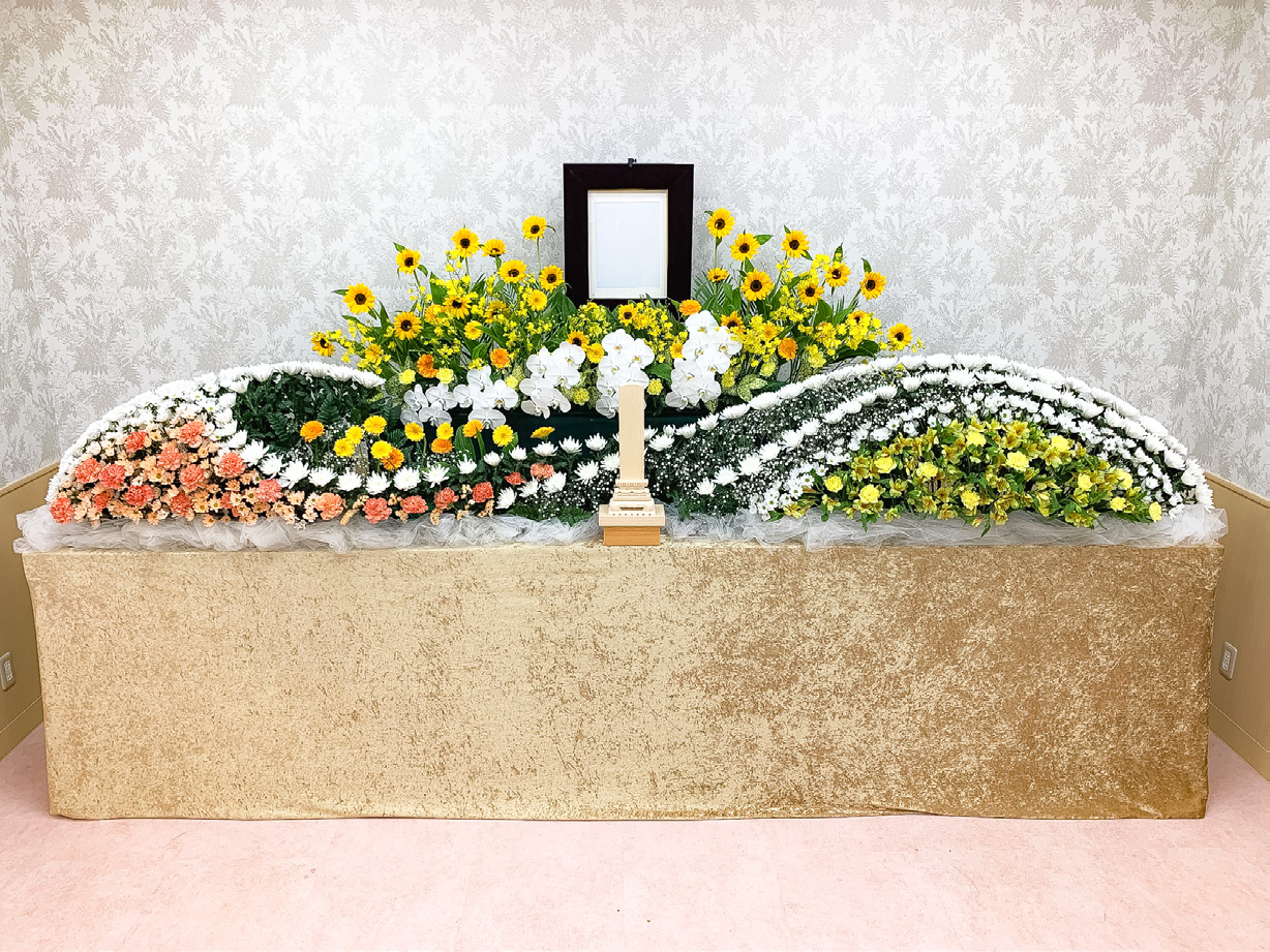 花祭壇が華やかに彩られ、素敵なお別れを感じさせます。
