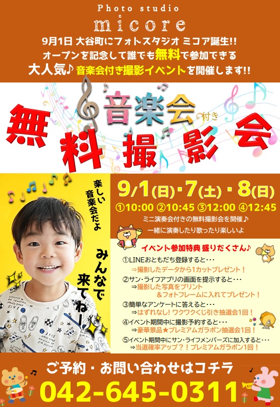 9月1日(日) 9月7日(土) 9月8日(日) ミニ演奏家と無料撮影会を開催させていただきます。