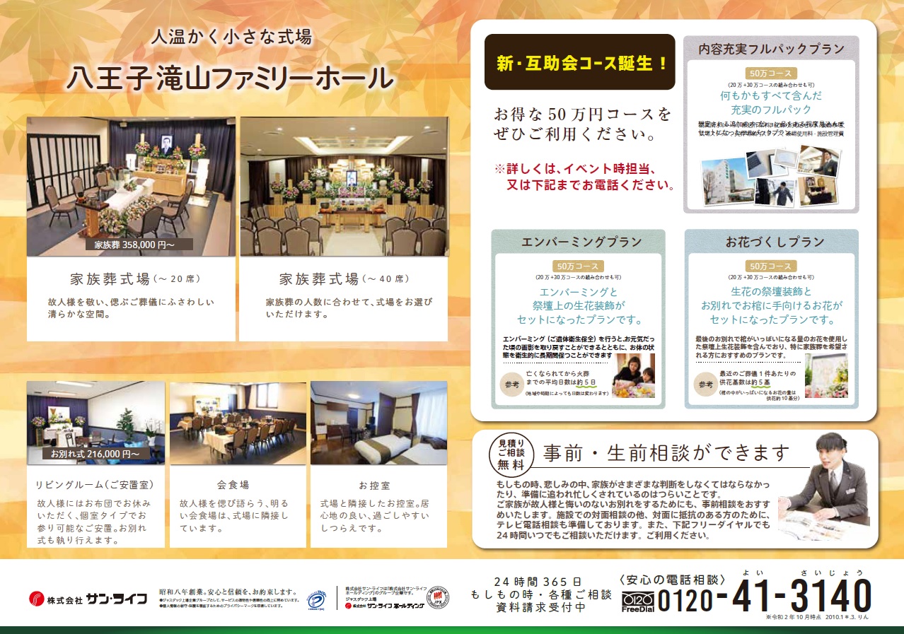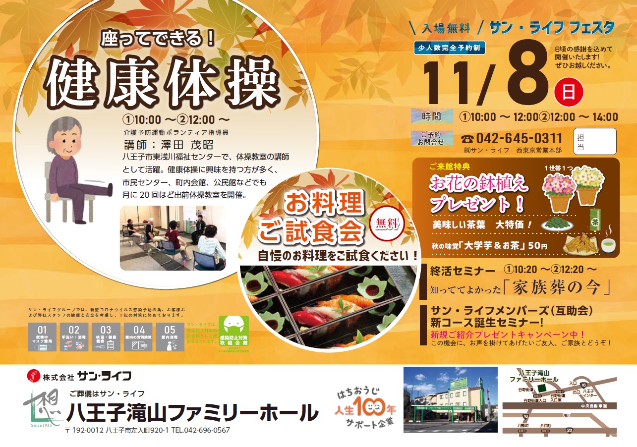 また八王子滝山ファミリーホールでは、11月8日(日)「サン・ライフフェスタ」を開催致します。