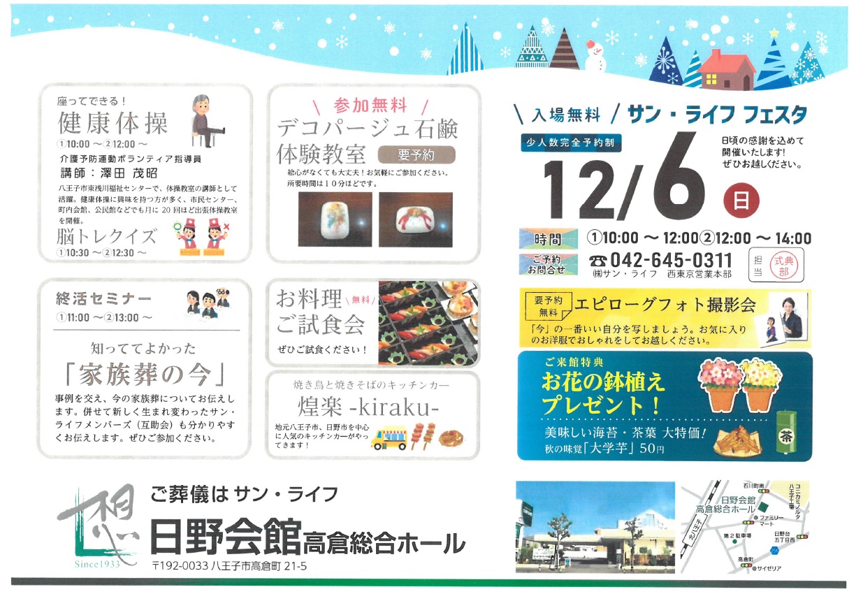 サン・ライフ フェスタに関する、ご予約・お問い合わせは 西東京営業本部 042-645-0311まで。