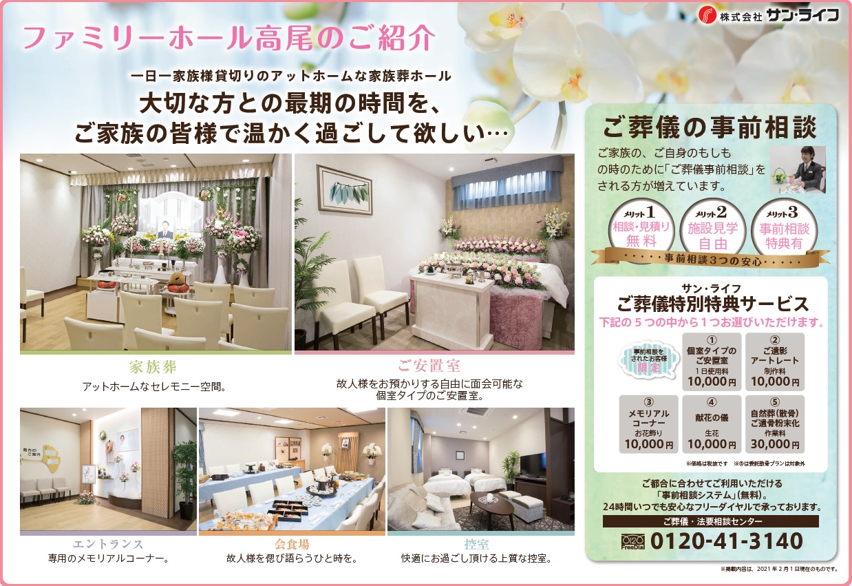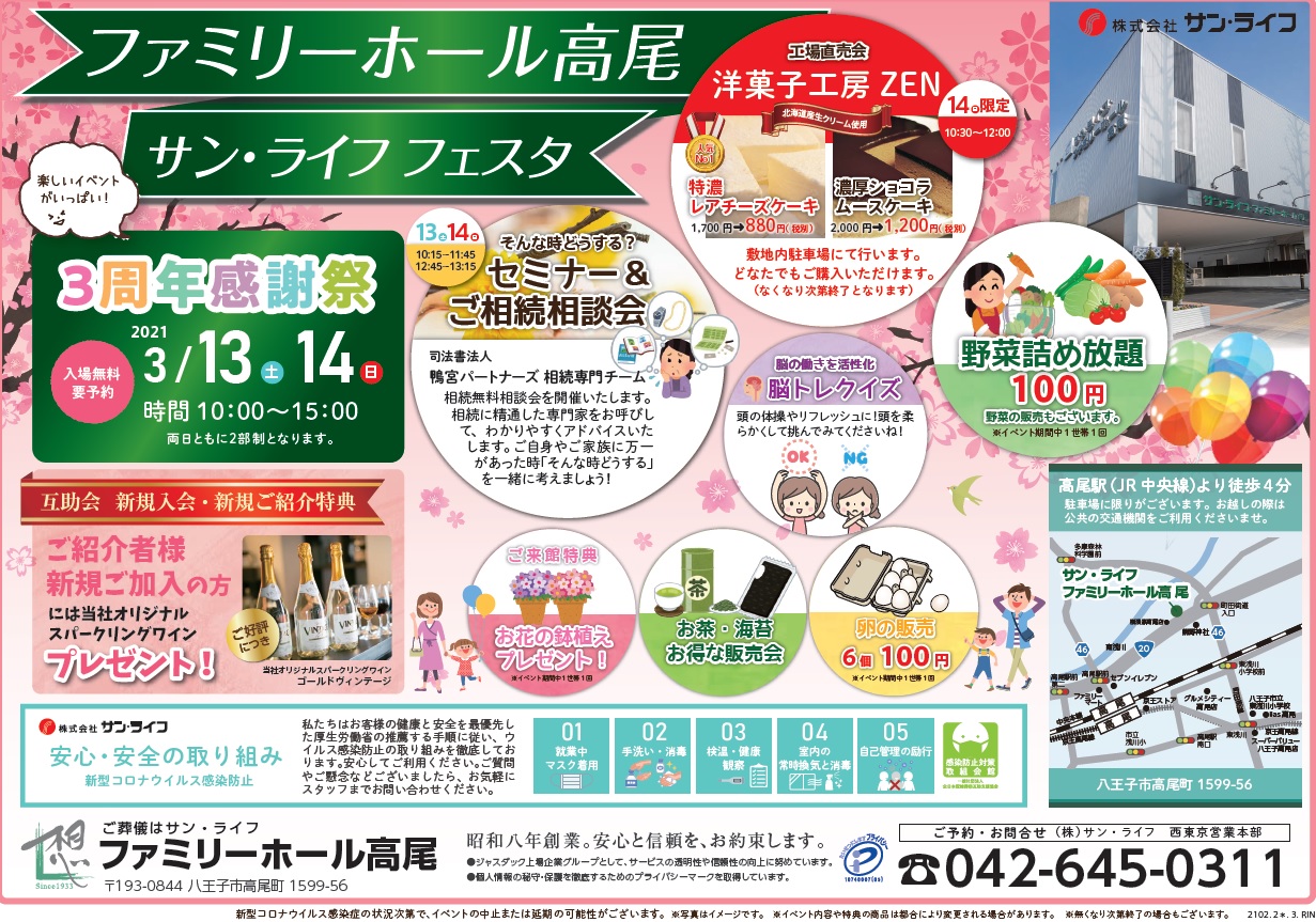サン・ライフ・ファミリーホール高尾 3周年感謝祭は完全予約制となっております。