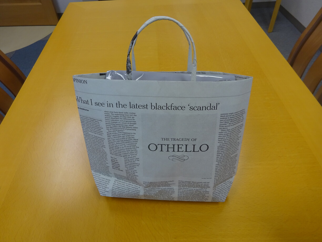 毎回恒例の制作体験、今回は英字新聞で作るオリジナルエコバッグの制作でした。