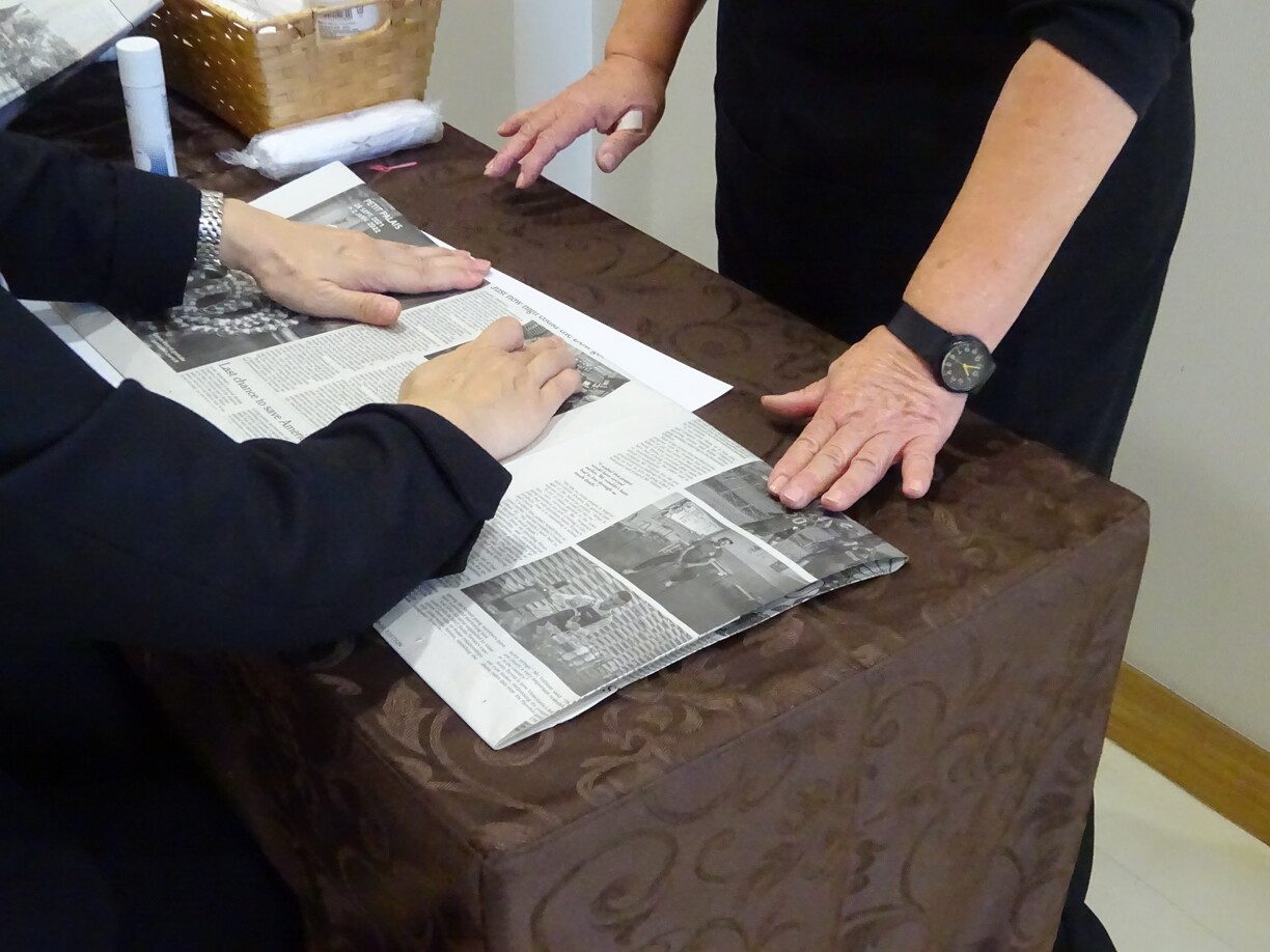 毎回恒例の制作体験、今回は英字新聞で作るオリジナルエコバッグの制作でした。